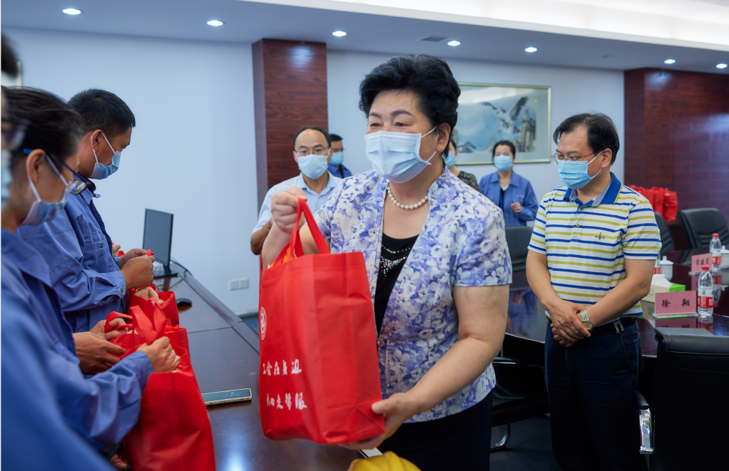 炎炎夏日,酷暑難耐。為進一步加強企業(yè)基層員工疫情防控意識,更好地保障一線職工群眾在高溫下正常生活,8月10日下午,市人大常委會副主任、總工會主席葛玉琴,市總工會黨組書記、副主席葛志娟到江天公司指導疫情防控工作,并看望慰問一線工作者。市國資委黨委副書記、副主任宋建宏,產(chǎn)控集團黨委副書記、副董事長、總經(jīng)理顧建國,黨委副書記、工會主席成剛等領(lǐng)導陪同。
